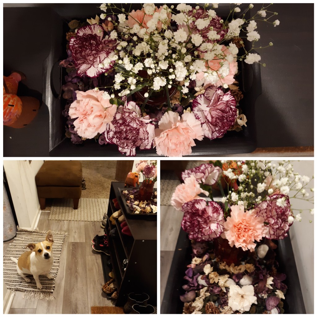 Sebelum renovasi di dekat pintu ada dua tumpuk rak sepatu plus kotak-kotak isi selendang dll, sekarang kotak-kotak saya pindahkan ke ruang cuci, di atas rak sepatu saya cuma taruh nampan dan vas bunga yang sebisa mungkin saya selalu isi dengan bunga , biar siapapun yang datang, langsung disambut dengan bunga gitu…