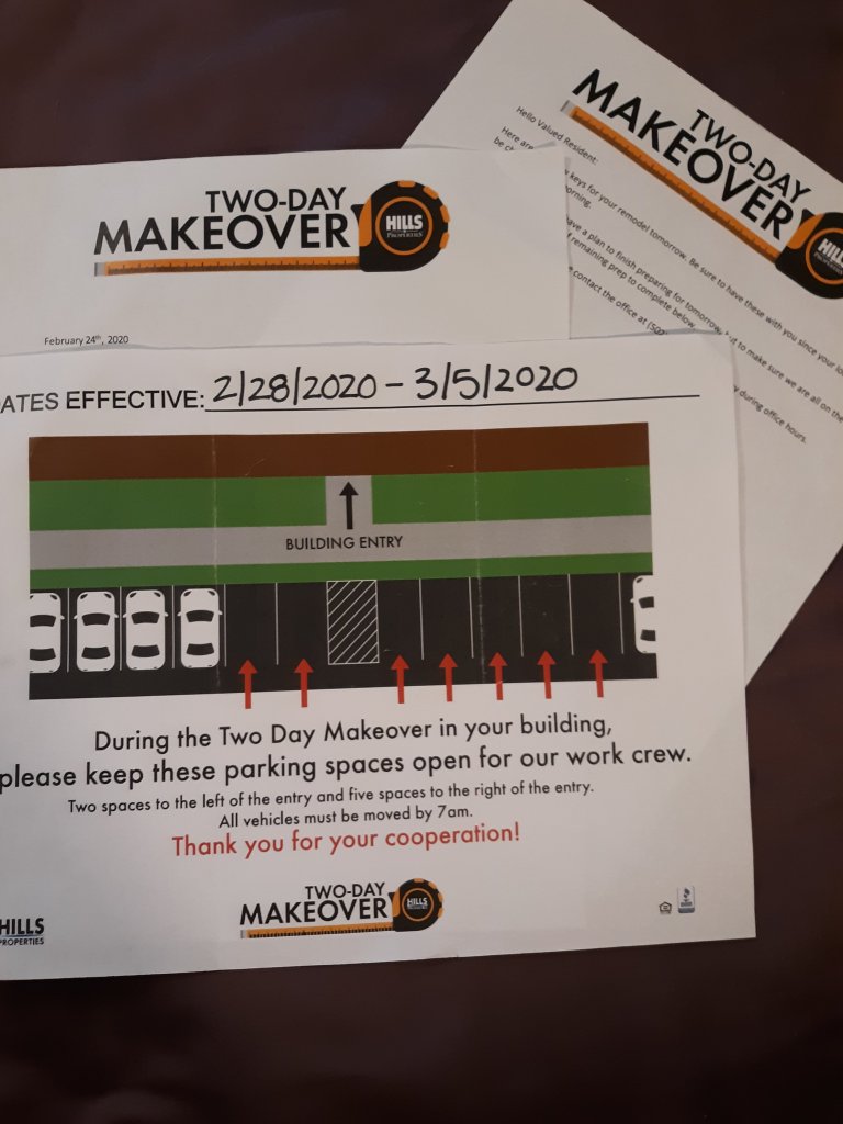 Sebulan sebelum renovasi di gedung kami dimulai, kami dikasih surat pengingat, dua minggu selanjutnya kami terima surat yang intinya memberi tahu apa-apa yang harus dilakukan dan tanggal berapa hari renovasi kami. Dari surat itu, kami tahu kalau hari renovasi itu tanggal 2 Maret, hari Senin. Kami harus memindahkan mobil yang diparkir di depan gedung untuk tenda para pekerja.