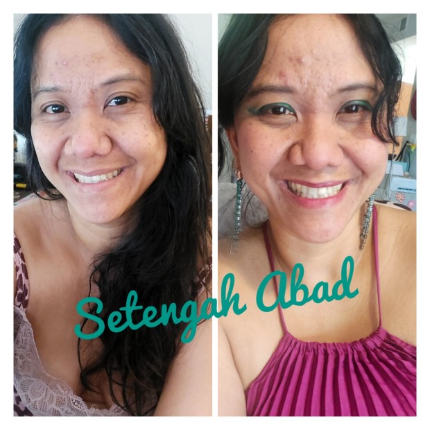 Saya juga sengaja potret diri, satu foto bener2 tanpa riasan wajah gitu, foto yang satu lain pake dembul. Tapi dua2nya gak pake filter. Biar inget pernah muda gitu….1🤪