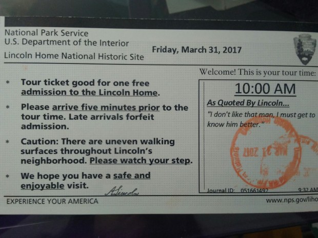 Untuk masuk ke rumah Lincoln, tidak dikenakan biaya – karena memang permintaan anak Lincoln waktu dia memberikan rumah ini ke negara bagian Illinois – tapi kita tidak boleh masuk sendiri, harus dengan pemandu tur, jadi pengunjung harus ambil tiket masuk.